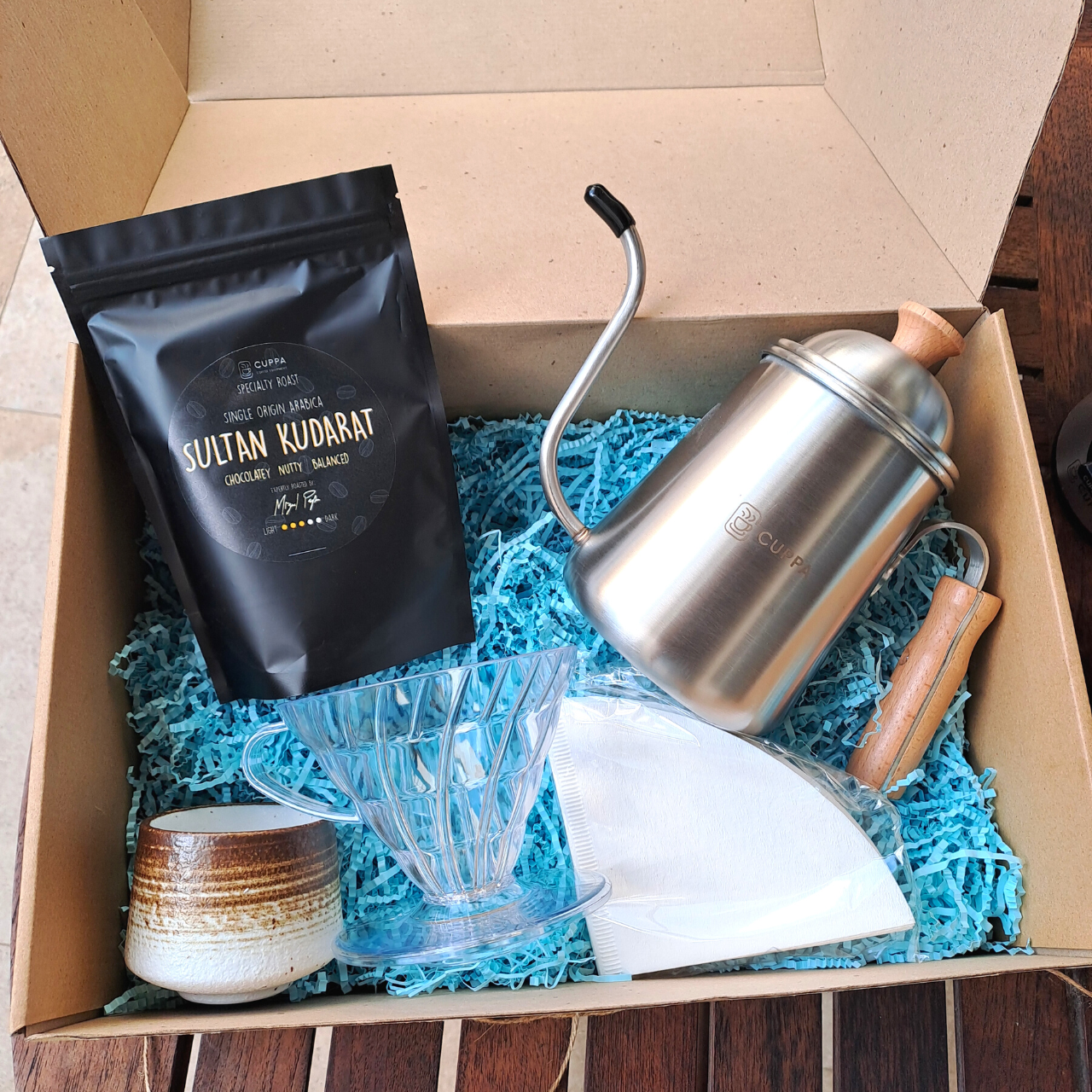 This gift box includes a sleek gooseneck kettle with wooden handle, a durable plastic dripper, a set of filter papers for clean refined brewing, and a small pack of freshly roasted coffee beans from our independent partner roaster.