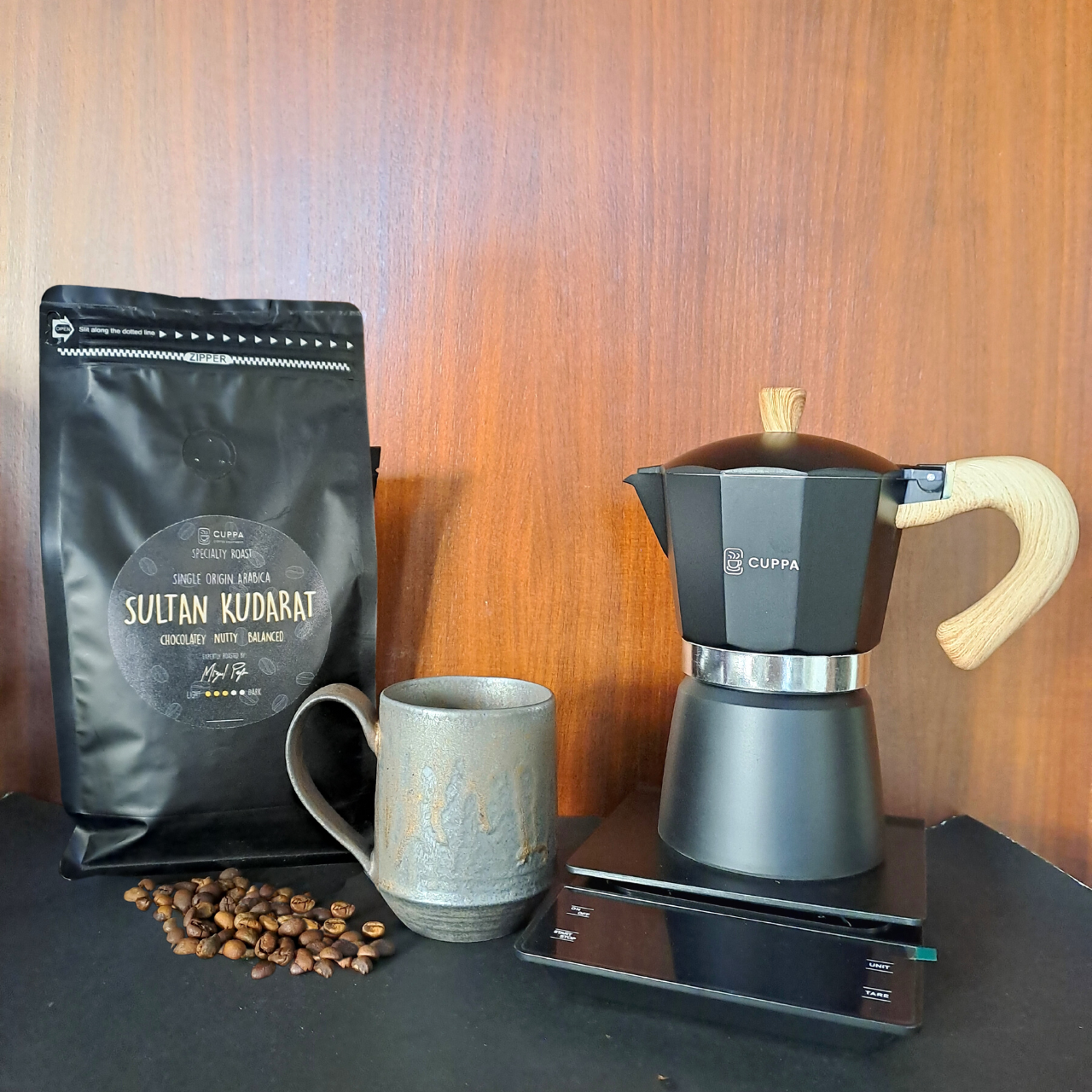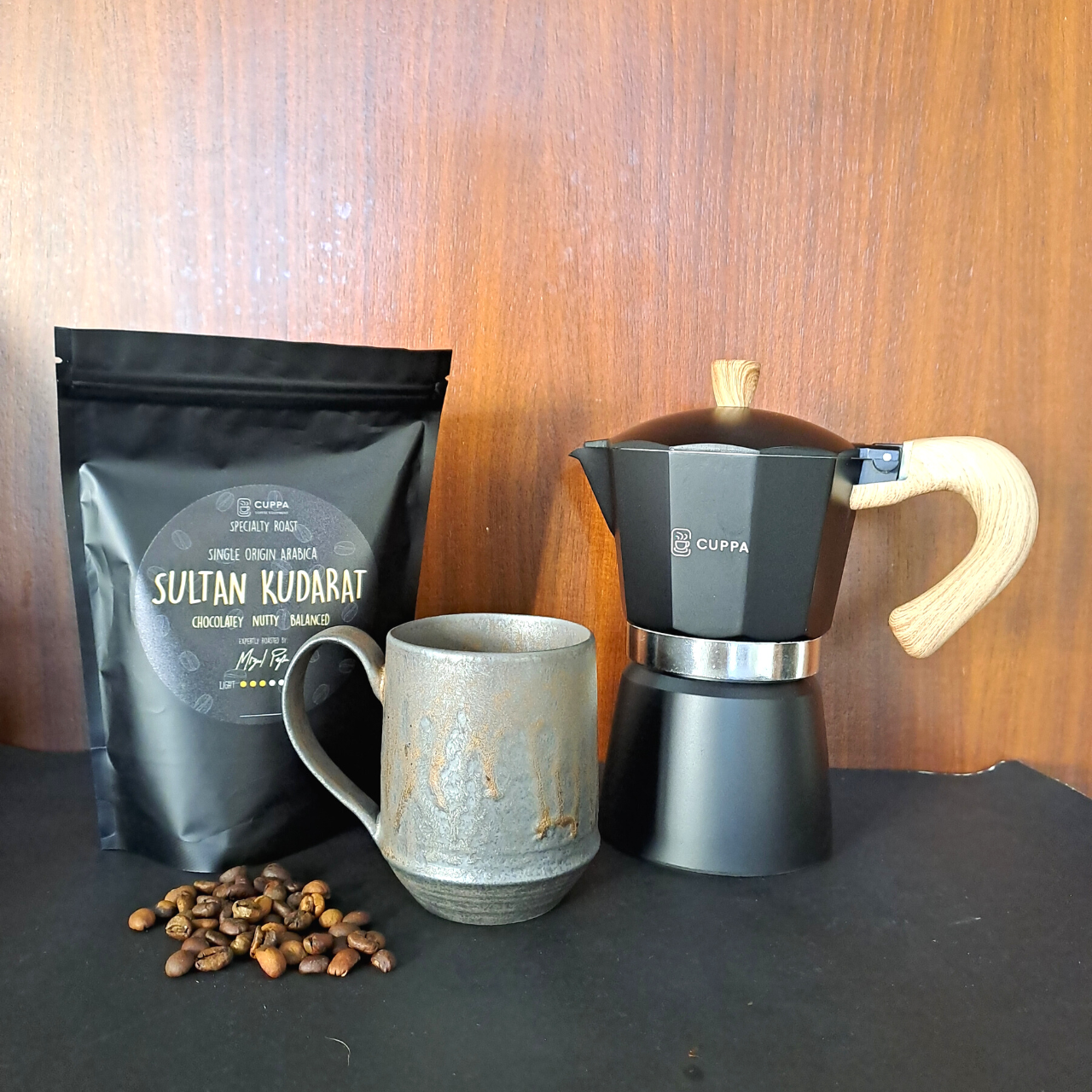 This kit features a stunning matte black Moka Pot capable of serving up to 6 rich and bold espresso shots. Paired with the exquisite Japanese Vintage Style Stoneware Cup, it's a match made in coffee heaven, along with a small pack of Sultan Kudarat Coffee beans for only P2,000