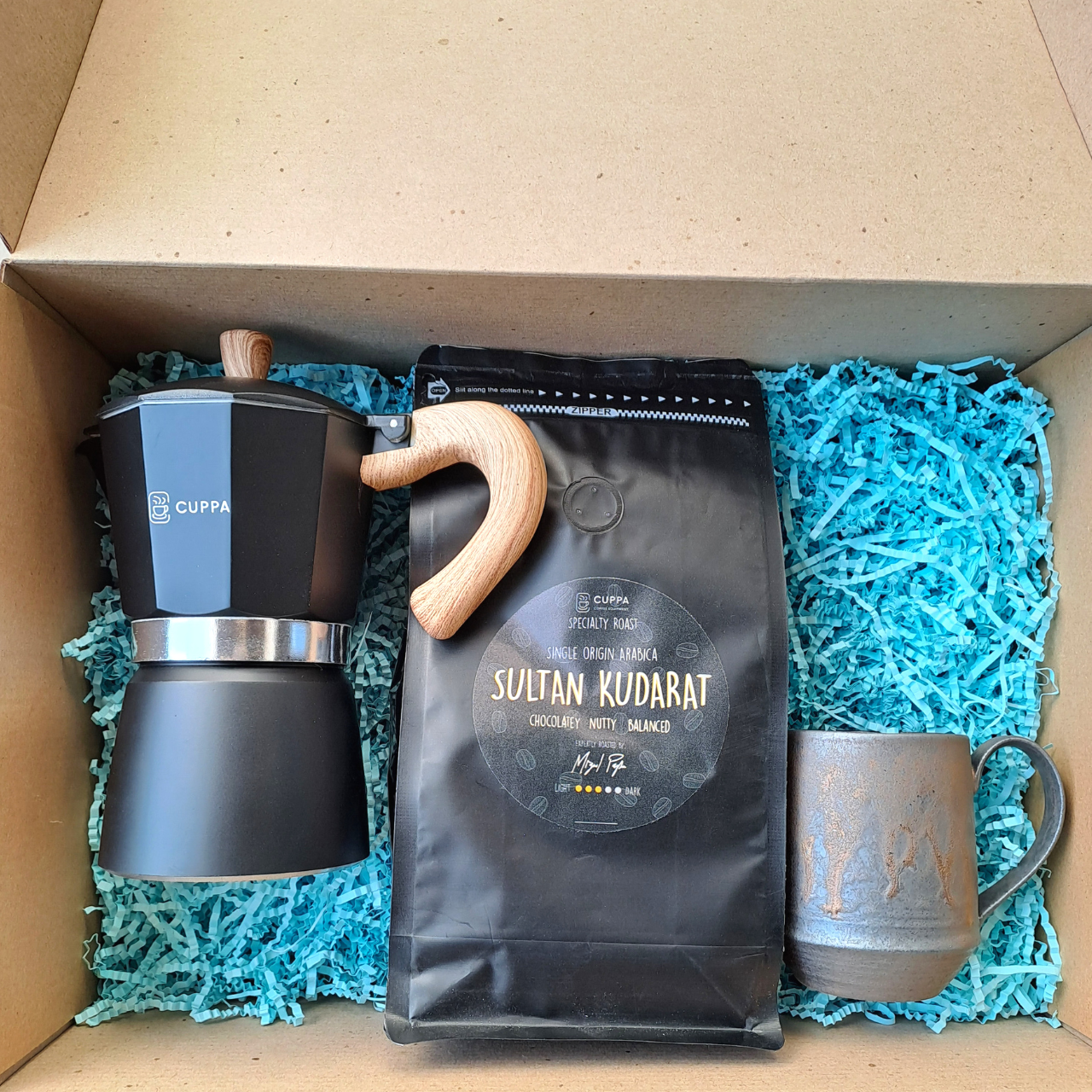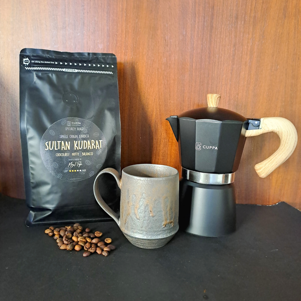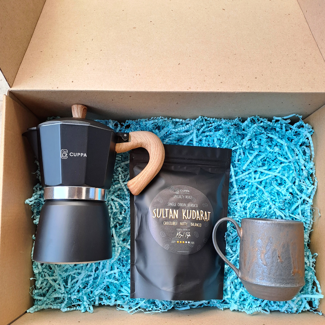 Indulge in the art of coffee brewing with this elegant kit, perfect for the discerning coffee lover. This gift box includes a matte black Moka Pot, a Japanese Vintage Style Stoneware Cup, and a large bag of Sultan Kudarat Coffee beans for only P2,500
