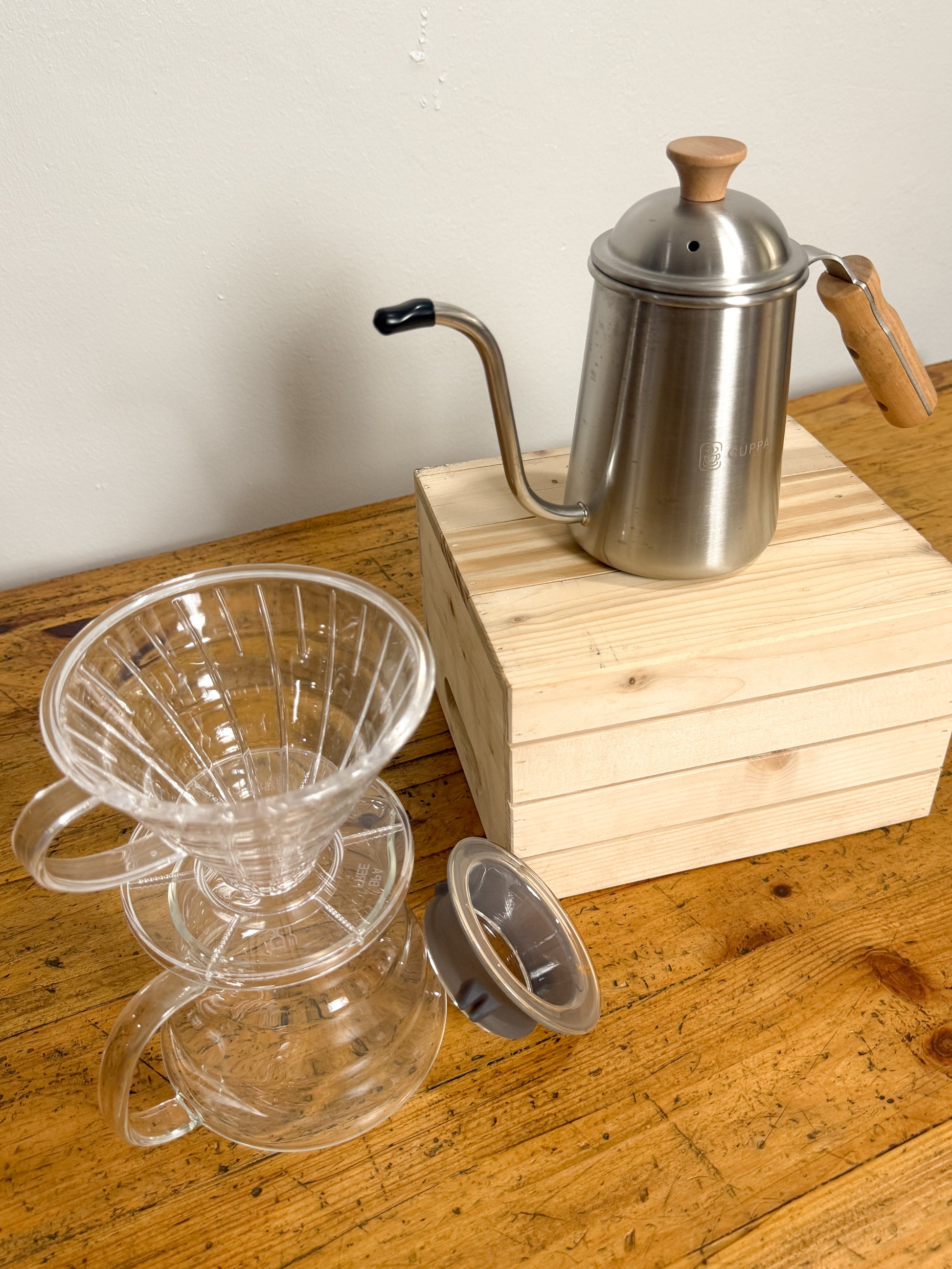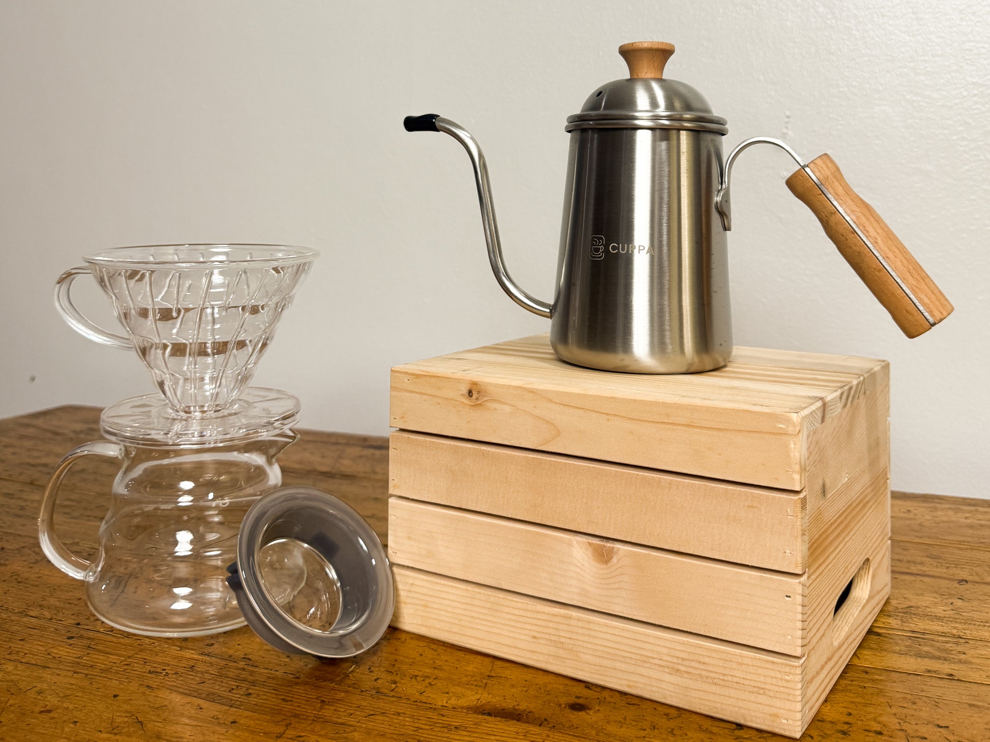 Brew great coffee in the great outdoors. Our Coffee Campout Enthusiast Bundle is designed for easy pour overs on the road, at camp, or anywhere your adventures take you. With a compact kettle, sturdy pitcher, and plastic V60 dripper, you can enjoy a clean, flavorful cup over your campfire.